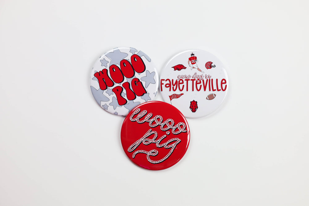Elevate your game day outfit with these University of Arkansas pin-back buttons!