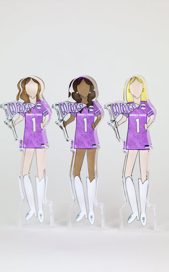 Bring your TCU game day spirit to life with these adorable TCU Game Day Girls acrylic shelfies! Dressed in purple jerseys, white cowboy boots, and waving “Go Frogs!” pennants, these art blocks are the perfect touch for any Horned Frog fan’s space. Whether you’re decorating a dorm room, office, tailgate setup, or bookshelf, these girls add a fun and spirited vibe to your decor. Made from durable acrylic with a stylish, modern design, they make great gifts for TCU students, alumni, and superfans. Celebrate Texas Christian University with this one-of-a-kind set that captures the charm and pride of game day in Fort Worth.